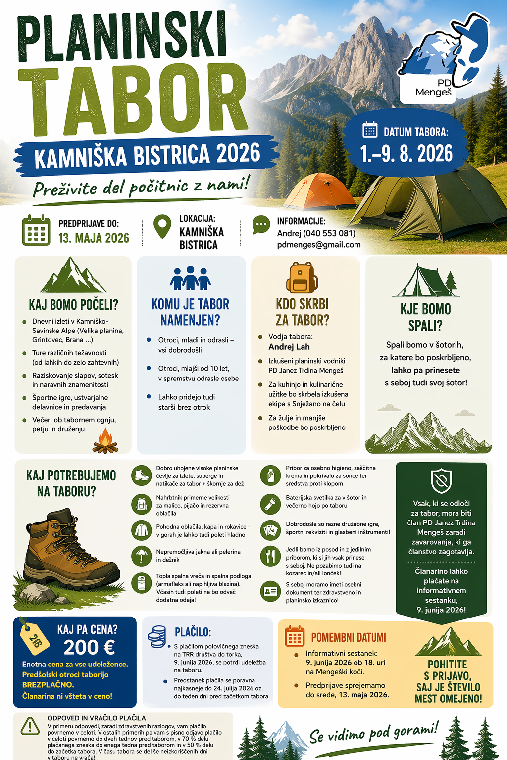 Vse informacije si lahko preberete v razpisnem letaku: Planinski tabor PD Mengeš 2026